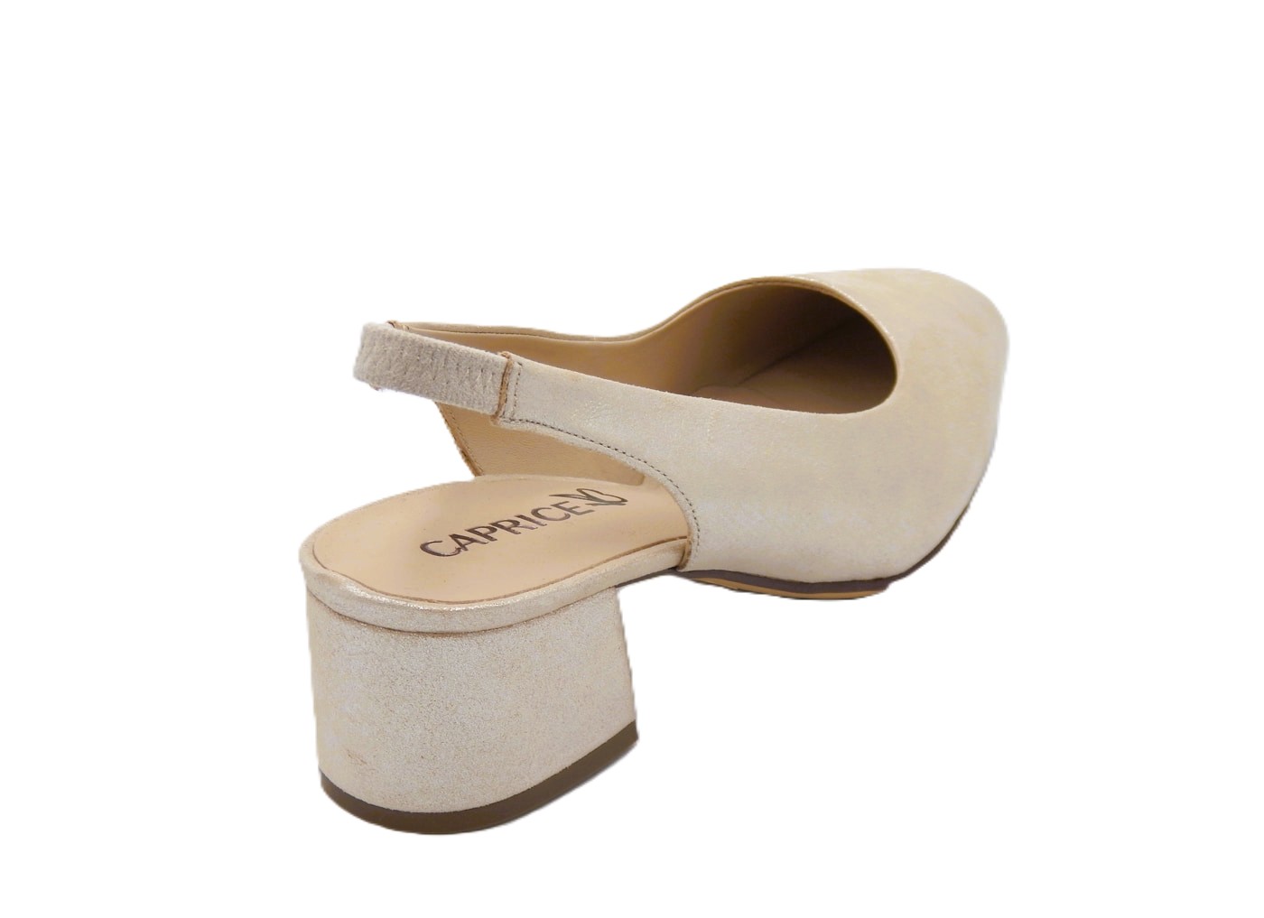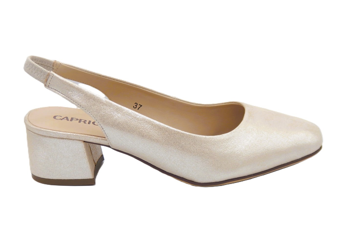 Caprice γυναικείες δερμάτινες slingback γόβες σε λευκό πέρλα-μεταλλικό χρώμα της συλλογής Άνοιξη -Καλοκαίρι 2026. Είναι ανατομικές, κατασκευασμένες από γνήσιο δέρμα ένα υλικό που τις κάνει να προσαρμόζονται στη φόρμα του ποδιού παρέχοντας επιπλέον άνεση. Ύψος τακουνιού 4,5εκ