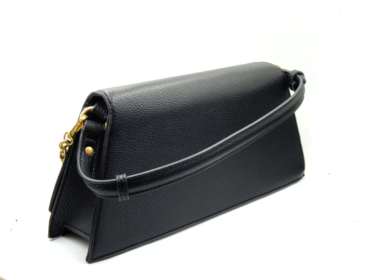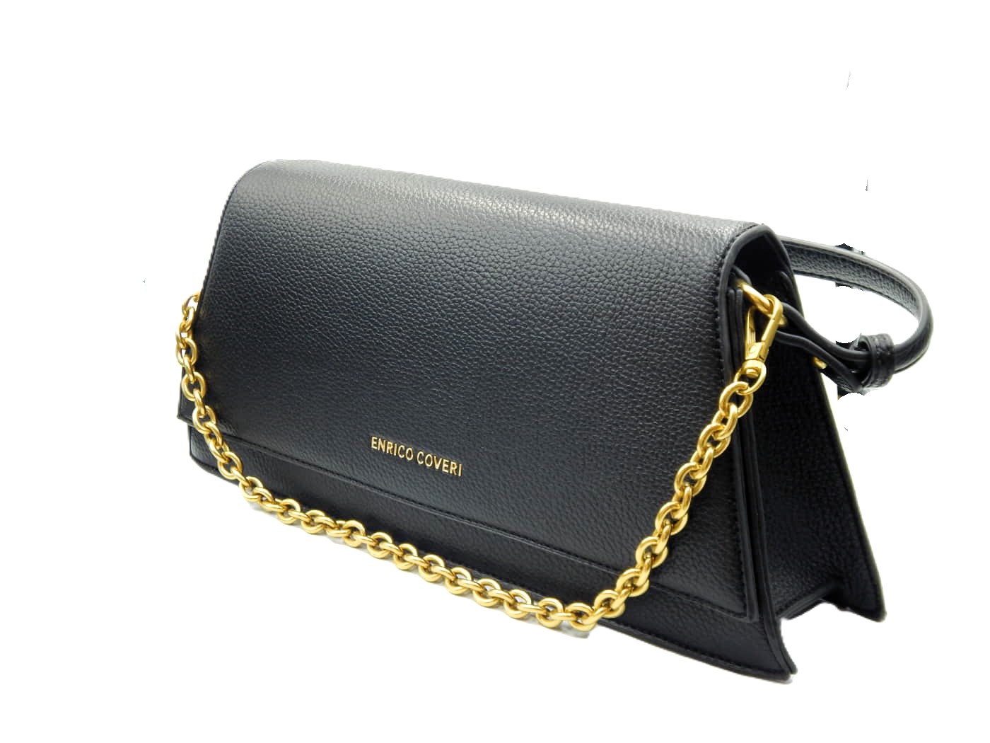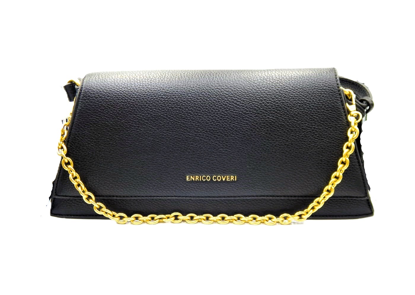 Γυναικεία τσάντα ώμου ENRICO COVERI από συνθετικό δέρμα εξαιρετικής ποιότητας σε μαύρο χρώμα. Κλείνει με καπάκι με μαγνητικά κλιπ και έχει διακοσμητική ,αποσπώμενη αλυσίδα σε χρυσή απόχρωση. Εσωτερικά διαθέτει μια μικρή θήκη με φερμουάρ και περιέχει και επιπλέον λουράκι για χρήση χιαστί.