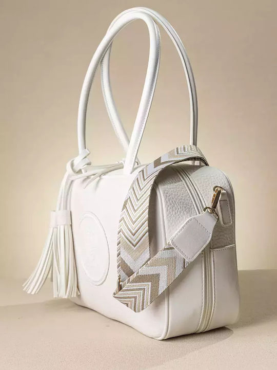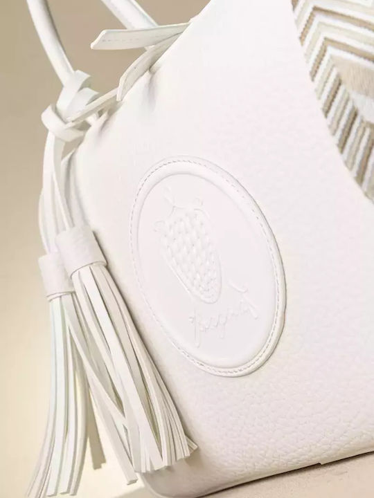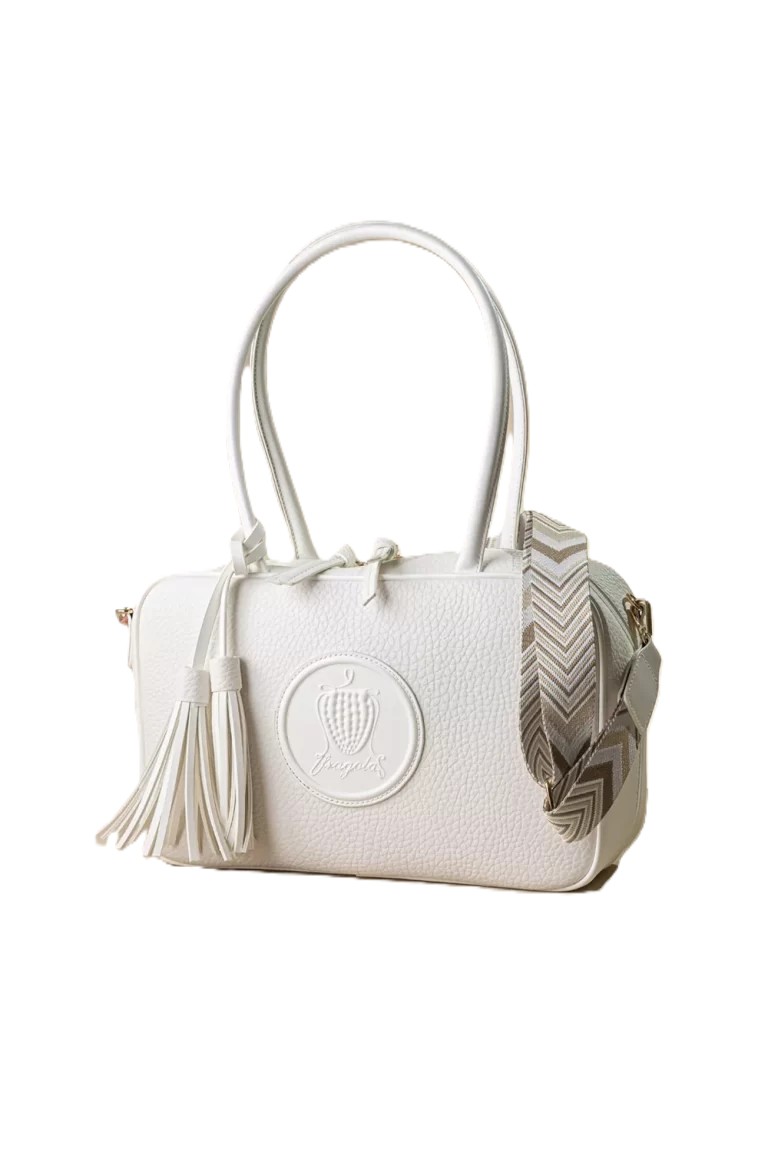 Fragola γυναικεία τσάντα ώμου και χιαστί σε λευκό χρώμα με έξτρα ιμάντα από ύφασμα. Τα φερμουάρ της ανοίγουν μέχρι κάτω περιμετρικά της τσάντας ώστε να τακτοποιείτε αλλά και να βρίσκετε όλα όσα χρειάζεστε. Στο εσωτερικό της θα βρείτε τα απαραίτητα μικρά τσεπάκια, ένα με φερμουάρ και ένα χωρίς για αποθήκευση μικροαντικειμένων. Διαστάσεις : Μήκος 34εκ – Ύψος 23εκ – Πλάτος 11εκ