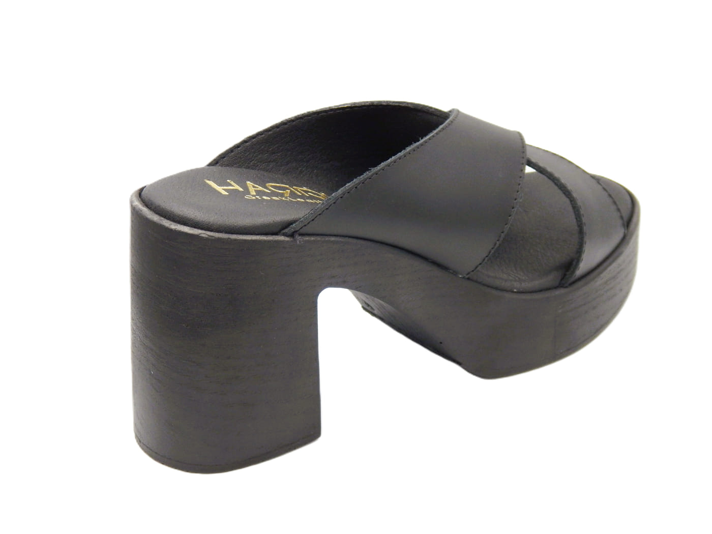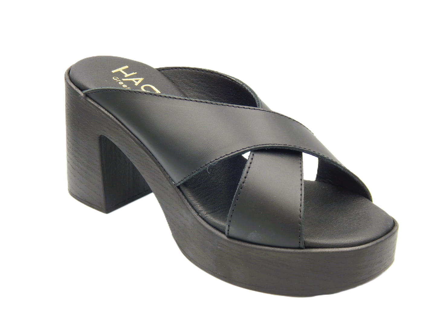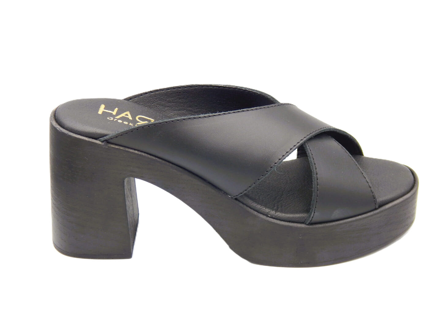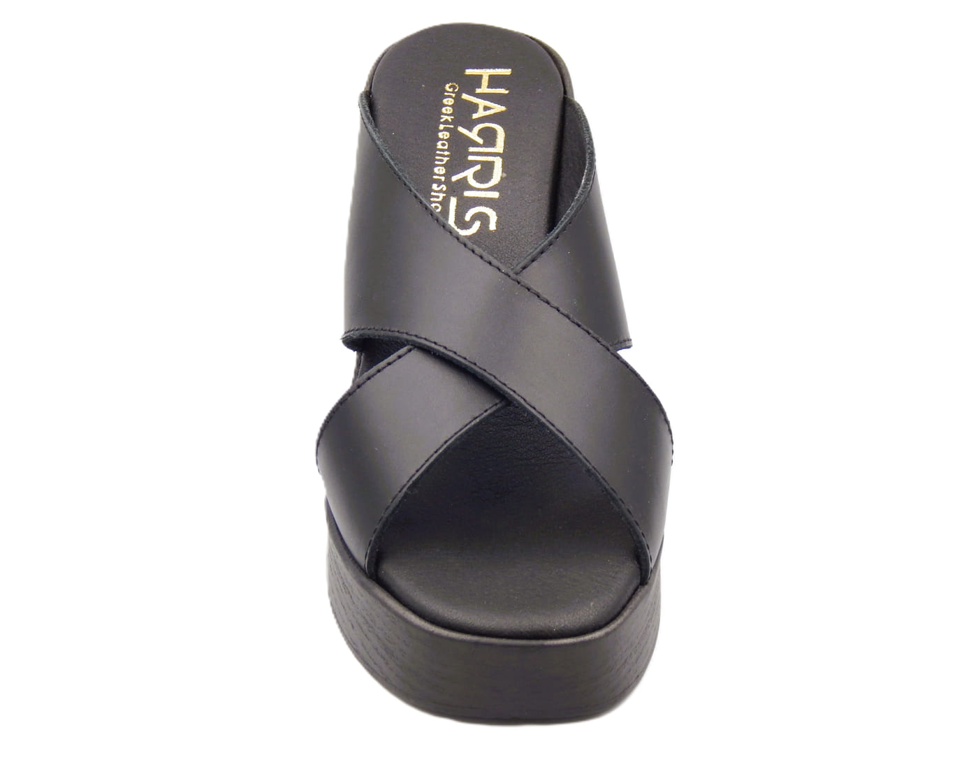 Harris γυναικεία δερμάτινα πέδιλα mule σε μαύρο χρώμα με τετράγωνο τακούνι κατασκευασμένα στην Ελλάδα, με ανατομική ελαστική σόλα και πολύ μαλακό πάτο με gel για καθημερινή χρήση. Ύψος τακουνιού 9εκ – ύψος φιάπας 3εκ