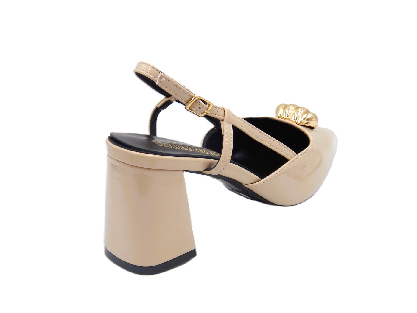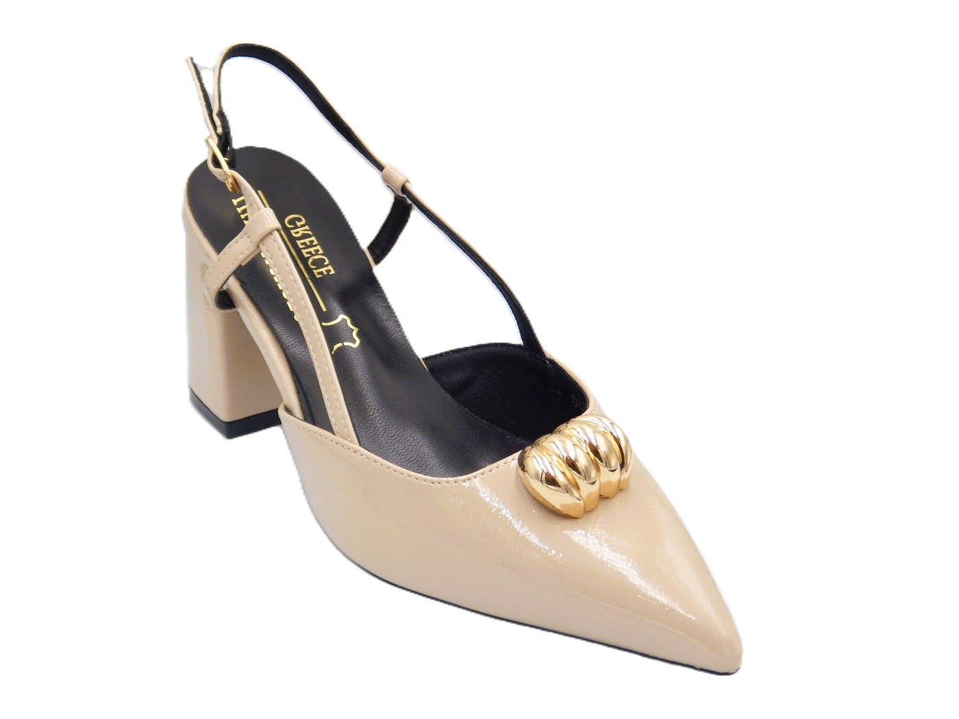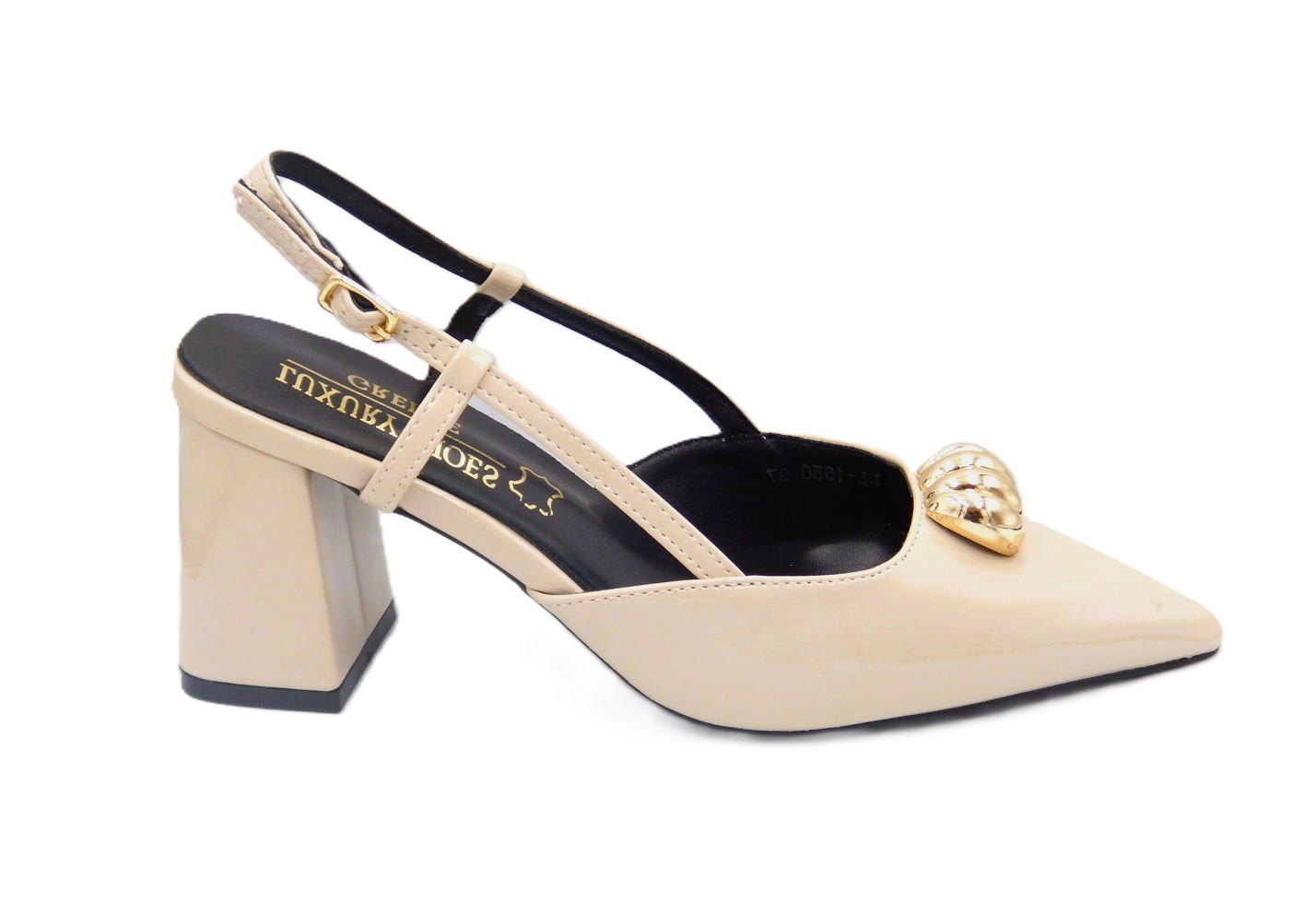 Luxury shoes γυναικείες γόβες slingback με τετράγωνο τακούνι σε μπεζ χρώμα στο πιο chic λουστρίνι σχέδιο της συλλογής SS26. Κατασκευασμένες στην Ελλάδα με δερμάτινο εσωτερικό πάτο με έξτρα μαξιλαράκι για απόλυτη άνεση και ξεκούραστο βάδισμα. Ύψος τακουνιού 8εκ