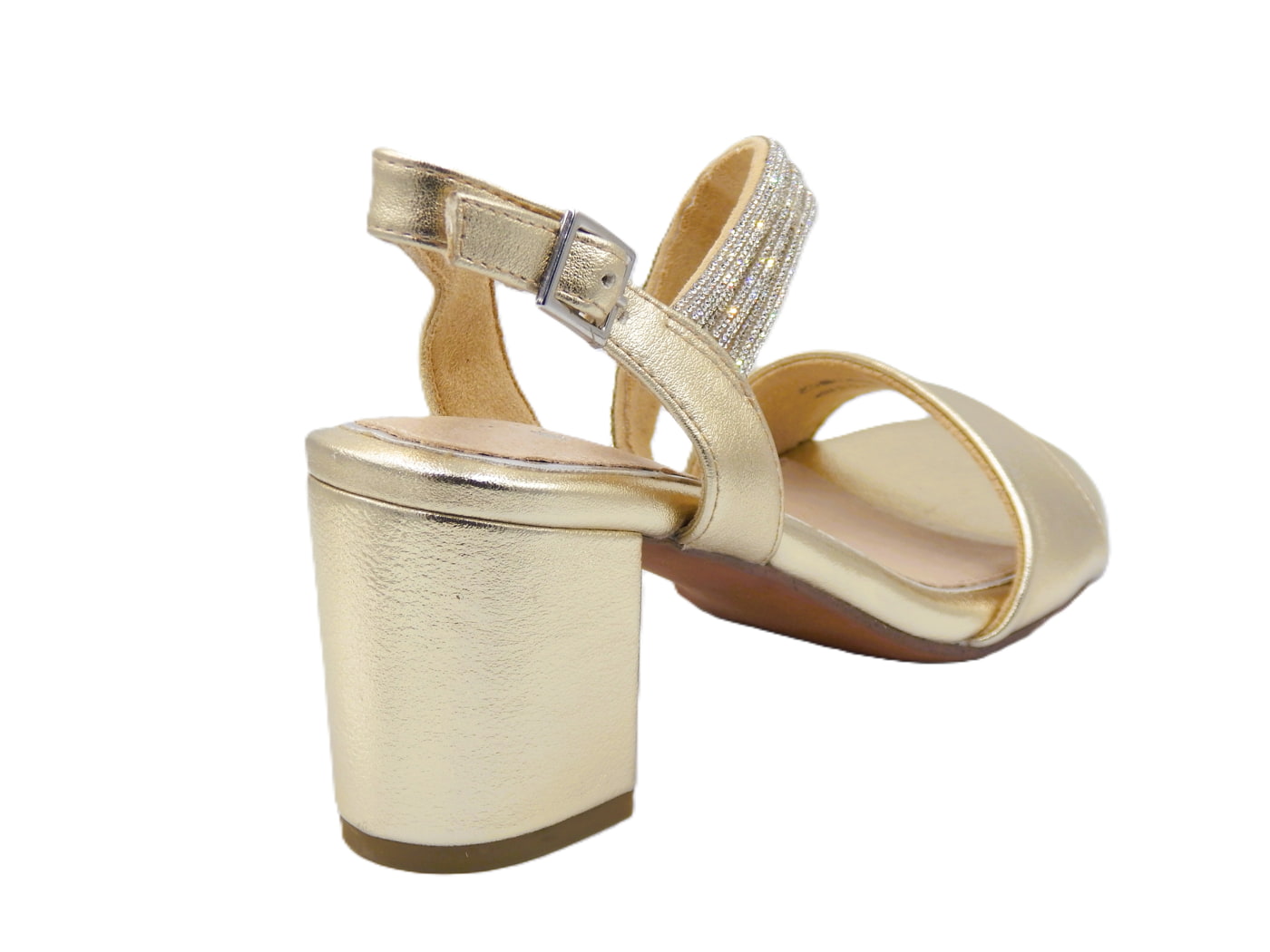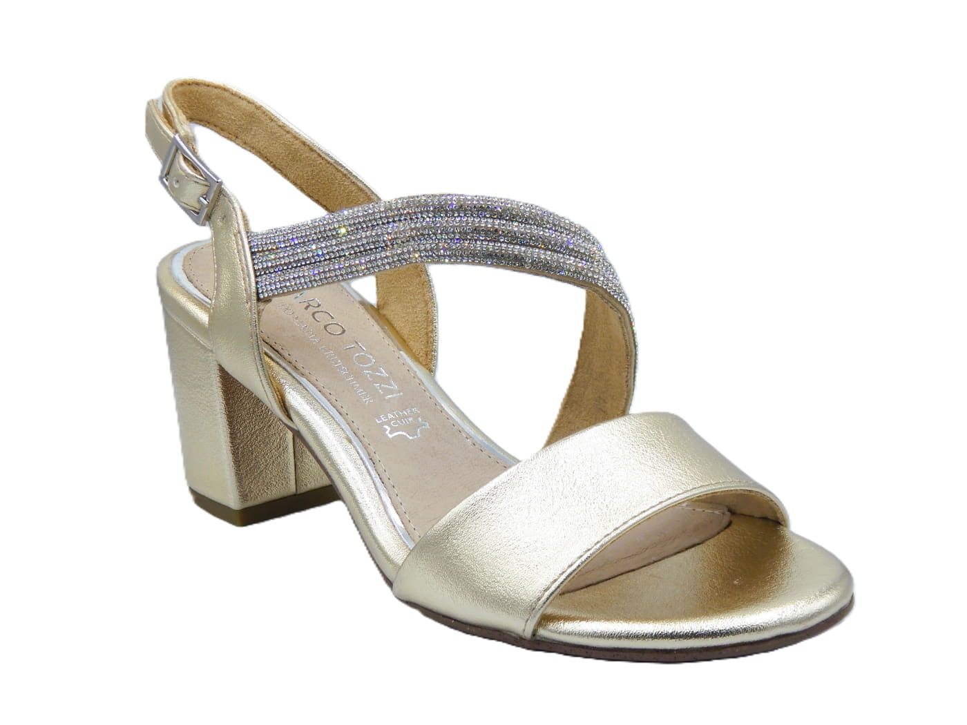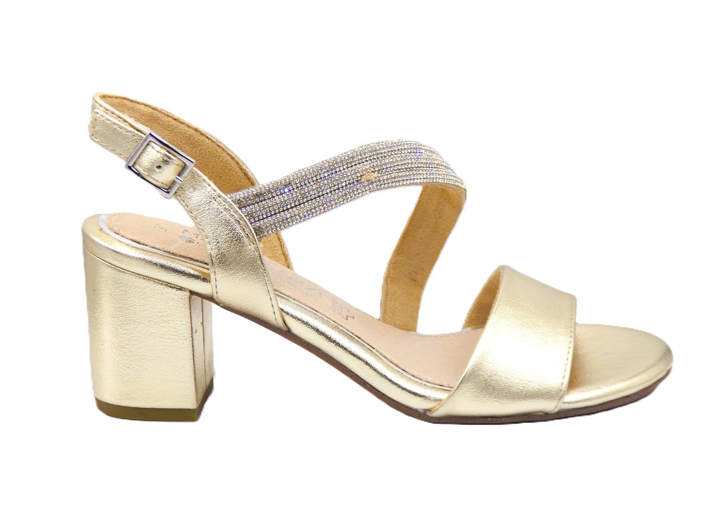 Marco Tozzi γυναικεία πέδιλα σε χρυσό – champagne χρώμα με λεπτομέρειες strass. Με τετράγωνο τακούνι ύψους 6,5 εκατοστών, ρυθμιζόμενο λουράκι και μαξιλαράκι στον πάτο για απόλυτη άνεση. Ιδανική επιλογή για γάμο, βάφτιση και για όλες τις περιστάσεις που θέλετε να εντυπωσιάσετε.