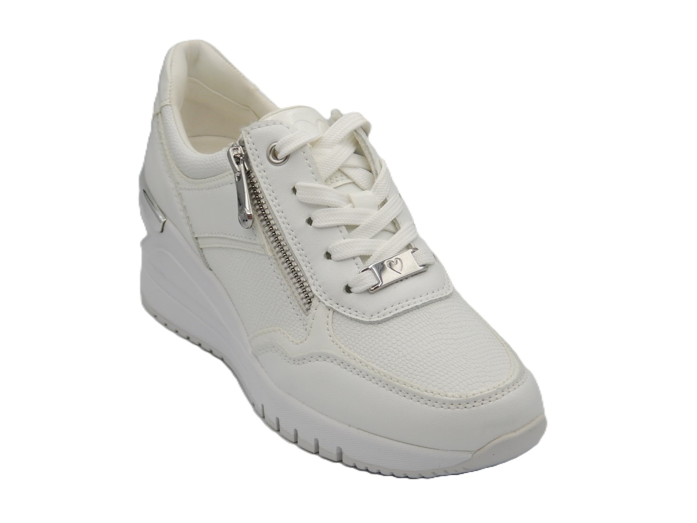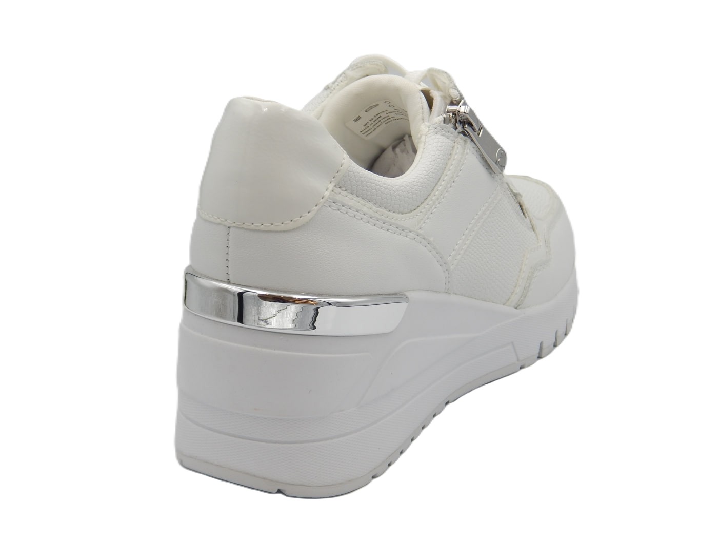 Γυναικεία sneakers MARCO TOZZI σε λευκό χρώμα με κορδόνια και λειτουργικό φερμουάρ για εύκολη και γρήγορη εφαρμογή. Ο εσωτερικός πάτος είναι αποσπώμενος, ανατομικός και πολύ μαλακός χάρη στο αφρώδες υλικό και τις τεχνολογίες feel me και balance. Η σόλα είναι αντιολισθητική και έχει ύψος 6εκ εκ. πίσω και 2 εκ. μπροστά.