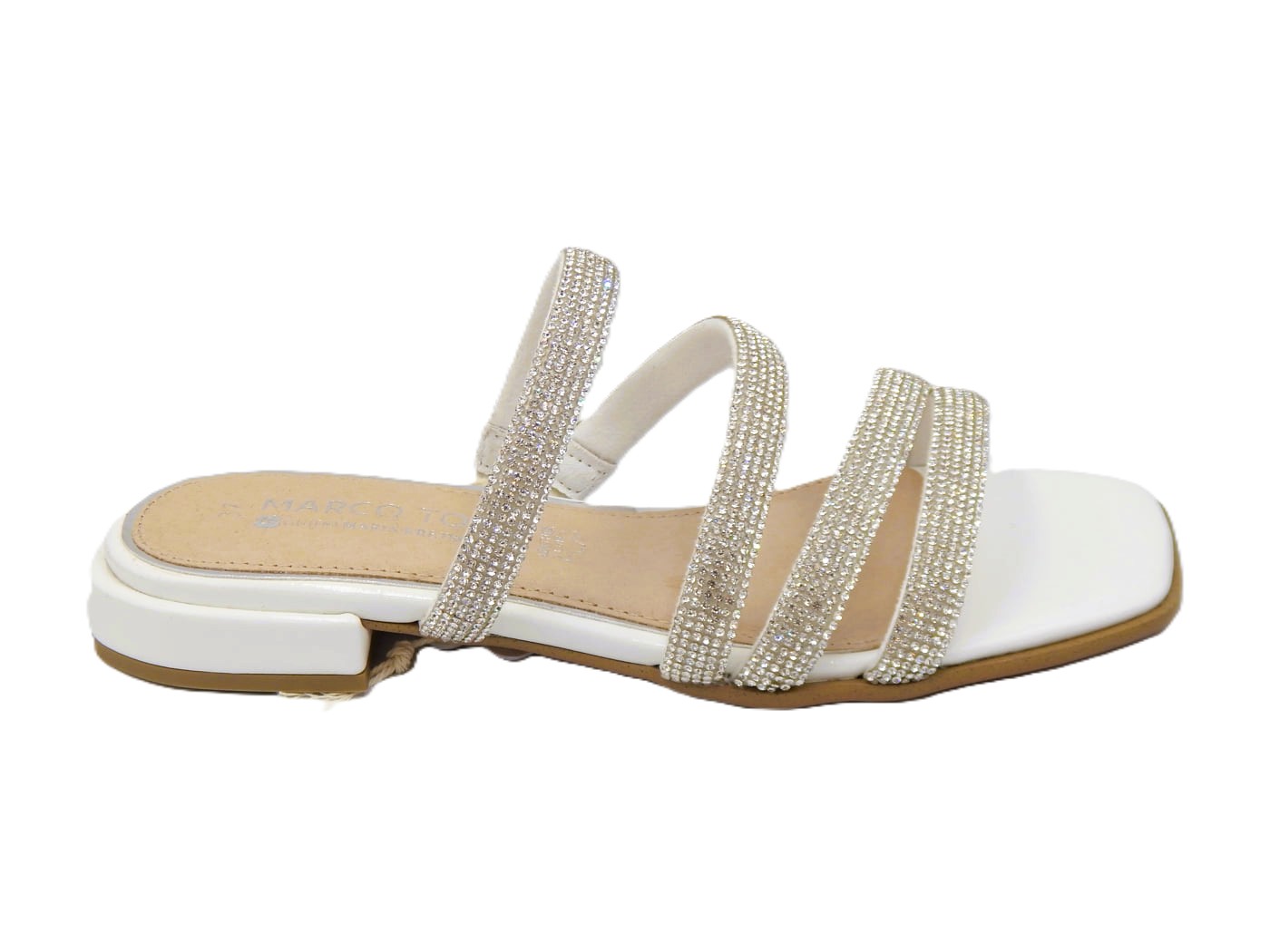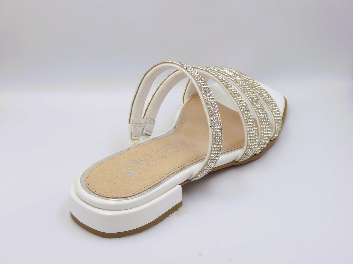 Marco Tozzi γυναικείες παντόφλες με strass σε λευκό με ασημί χρώμα. Ολοκλήρωσε και εντυπωσίασε σε κάθε σου εμφάνιση με αυτό το ξεχωριστό σχέδιο από τη συλλογή Άνοιξη _ Καλοκαίρι 2026. Διαθέτουν δερμάτινο πάτο και εξτρα μαξιλαράκι για απόλυτη άνεση.