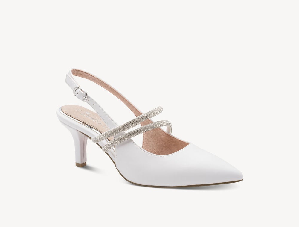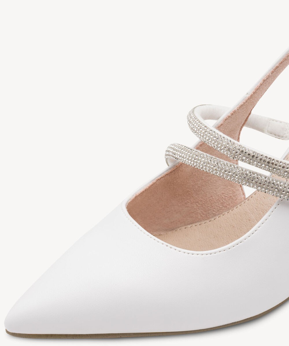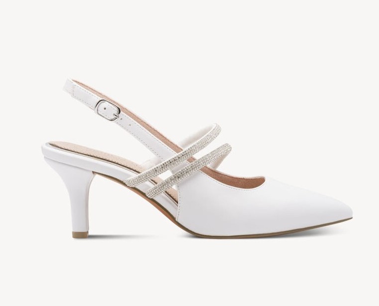 Marco Tozzi γυναικείες slingback γόβες σε λευκό χρώμα με λεπτομέρειες strass και τακούνι 6,5 εκατοστών. Ένα άκρως εντυπωσιακό σχέδιο για να τραβήξεις τα βλέμματα σε κάθε περίσταση όπως γάμος, βάφτιση. Με ενσωματωμένο μαξιλαράκι στον πάτο για έξτρα άνεση!